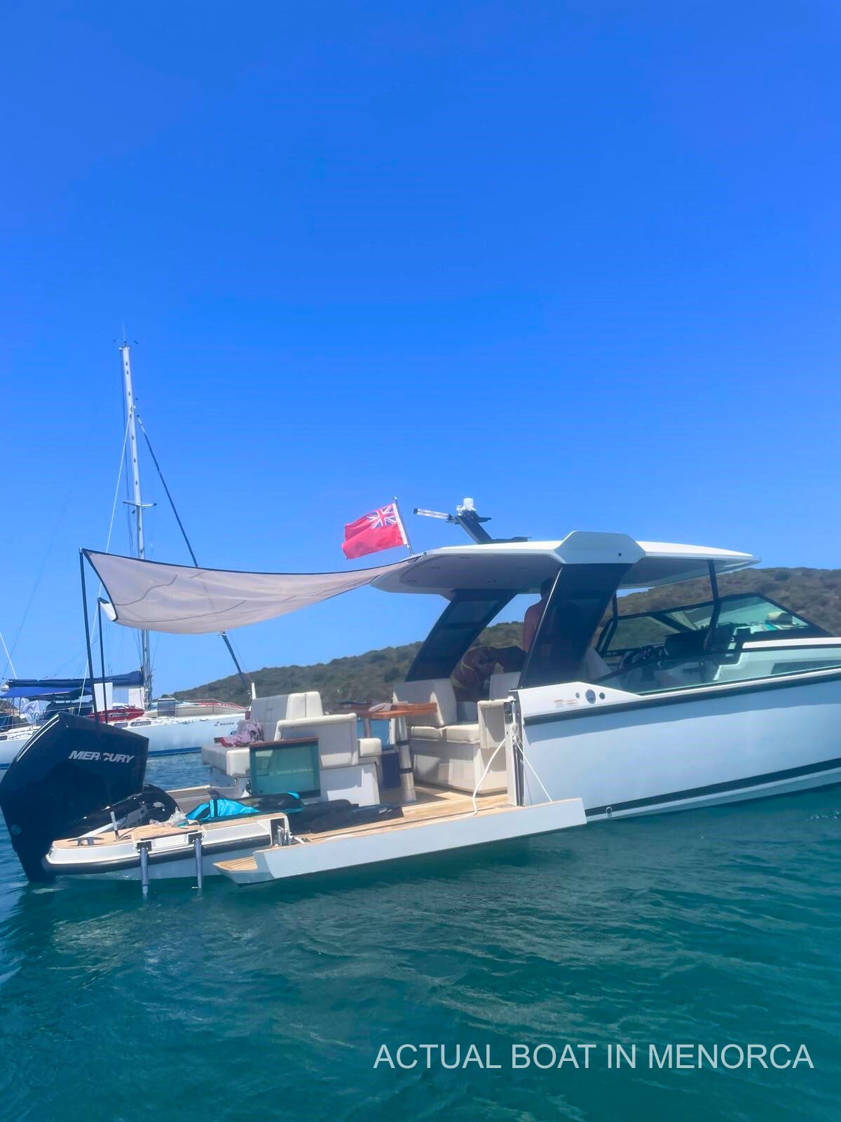 This 2024 model is fitted with twin 300hp Mercury V8 outboards with joystick control and only 78 hours of use. Fully equipped throughout, this boat has all of the most sought-after options including bow thruster, generator replacement system, flexi-teak flooring, audio package and more. Main dealer maintained since new and inside winterisation.