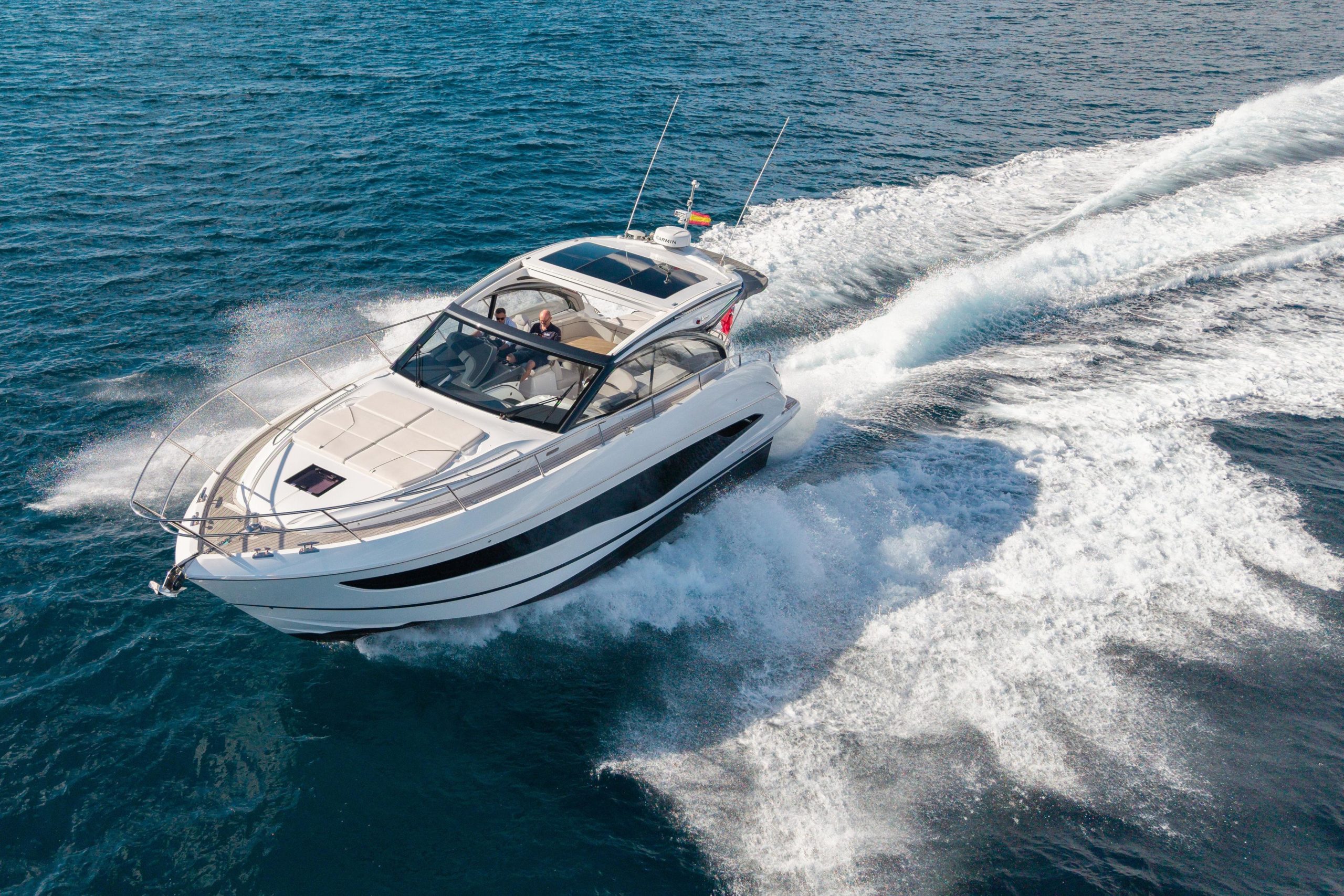 2025 Model, build 2024 • Twin Volvo IPS engines with Volvo IPS System • 2 Cabins accommodating 4 guests • Allure Collection styling with electric blue canopy blade • Walnut interior wood satin finish • Quick MC2 16 Gyro Stabiliser with Volvo DPS (Dynamic Positioning System) • Onan 11kW Generator with hydrohush exhaust • Tropical spec reverse cycle air-conditioning/heating including cockpit • Electro-hydraulic Passerelle with teak finish • Full teak side decks and foredeck • Garmin dual 16″ MFDs with radar • Bow thruster • Underwater transom lights • JL Audio cockpit speakers with amplifier • Fusion TV and audio packages in all cabins • Onboard WiFi with 4G/5G antenna • Dishwasher and Kenyon electric BBQ in cockpit wetbar • Convertible lower dinette berth • Scissor berths in forward cabin