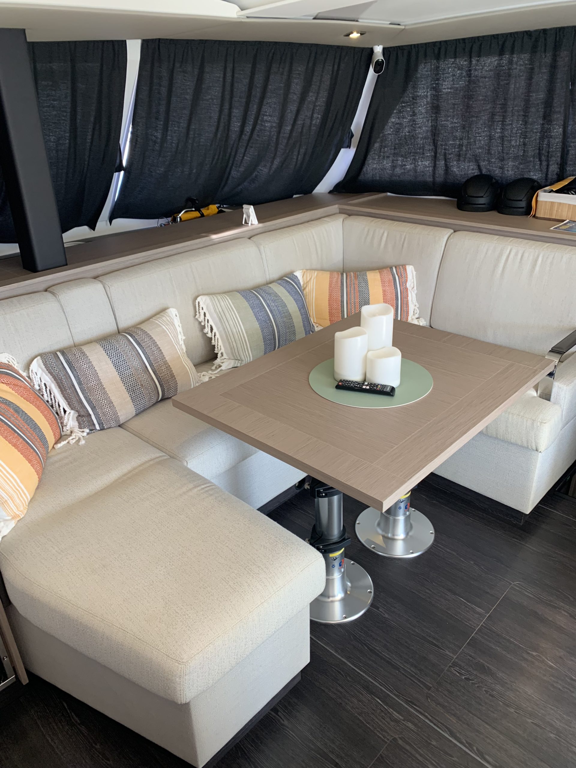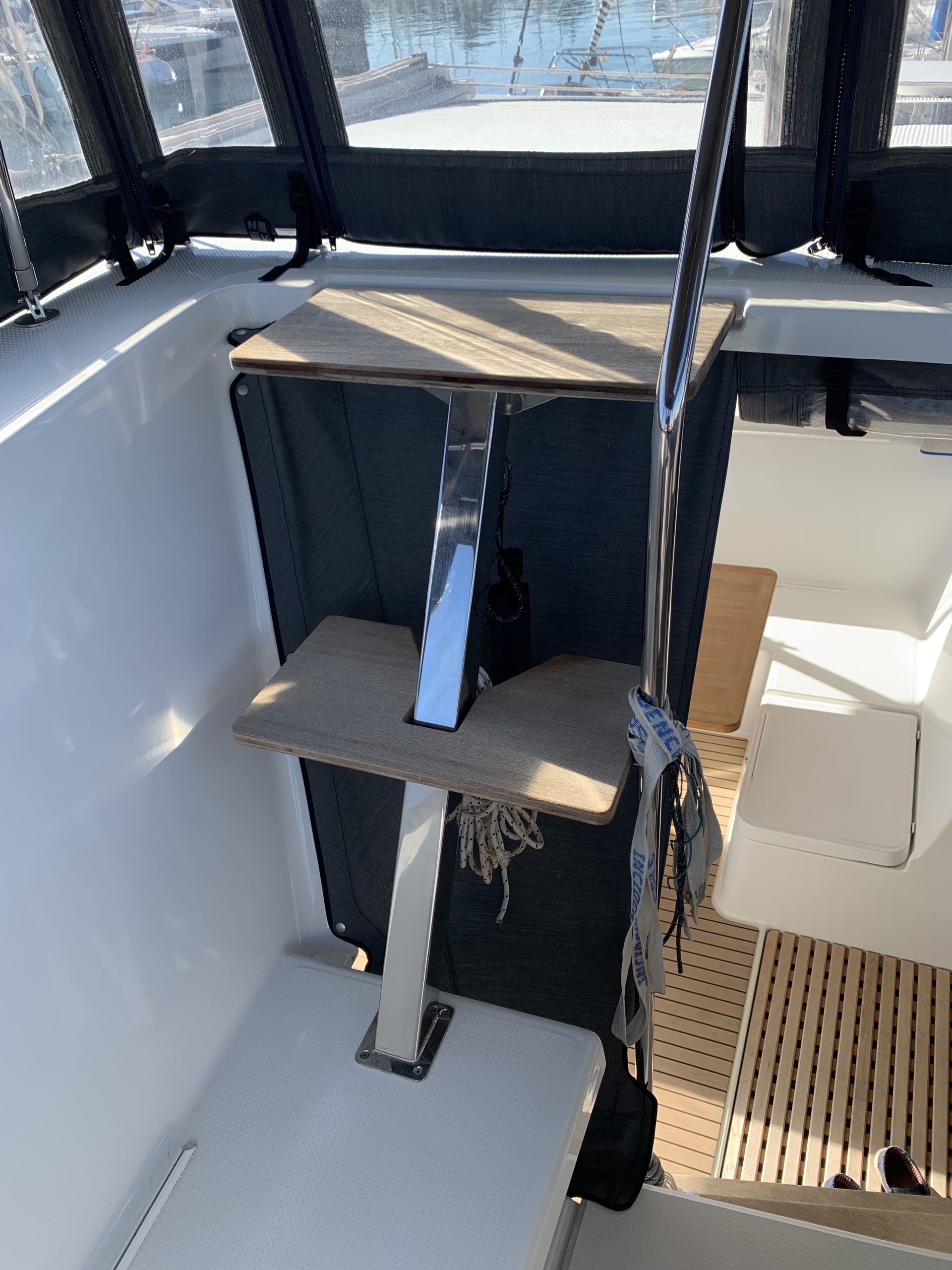 - L-shaped cockpit seating with teak cockpit table