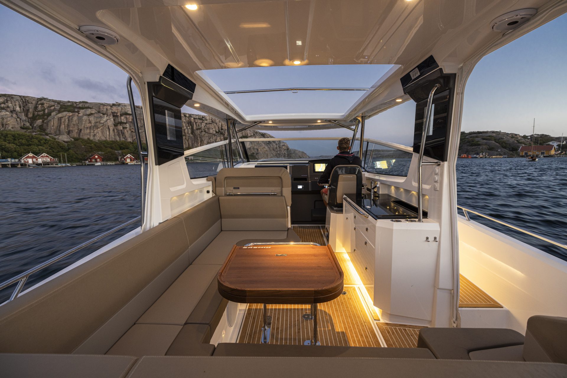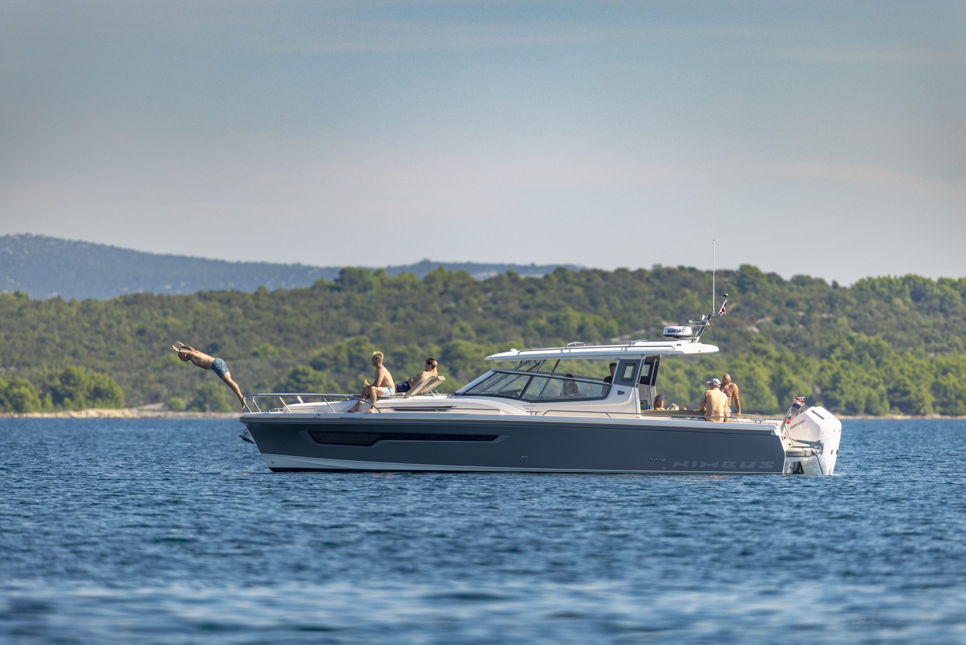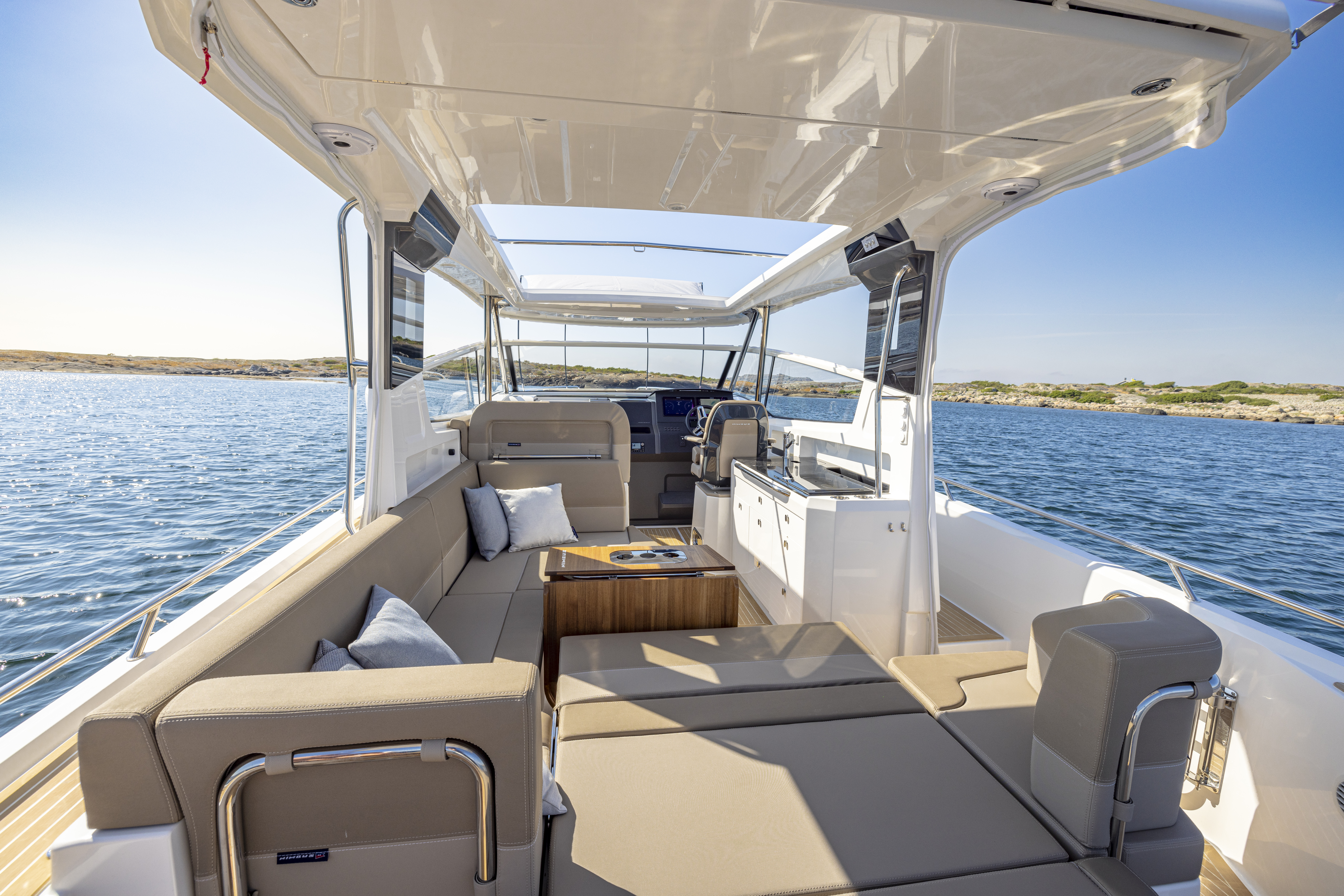 Nimbus created the award-winning W11 to be the ultimate weekend cruiser, allowing you to extend your boating adventures, cruiser further and spend time with loved ones. The W11 features the popular Nimbus sidewalk design, which helps amplify the interior space and provides easy and safe movement on deck. The layout and multifunctional seating arrangements are specially designed for social activities and entertaining, with the several large social areas perfect for hanging out with friends or family, relaxing, taking a swim or soaking up the sun on either the fore deck or aft deck. New features are the folding side balcony for added space and flexibility when anchored, and the optional hydraulic swim platform that extends aft of the engines allowing guests to be closer to the water and for super-easy boarding. Below deck there is space for four people to stay comfortably overnight in two berths and a spacious bathroom with toilet and shower.