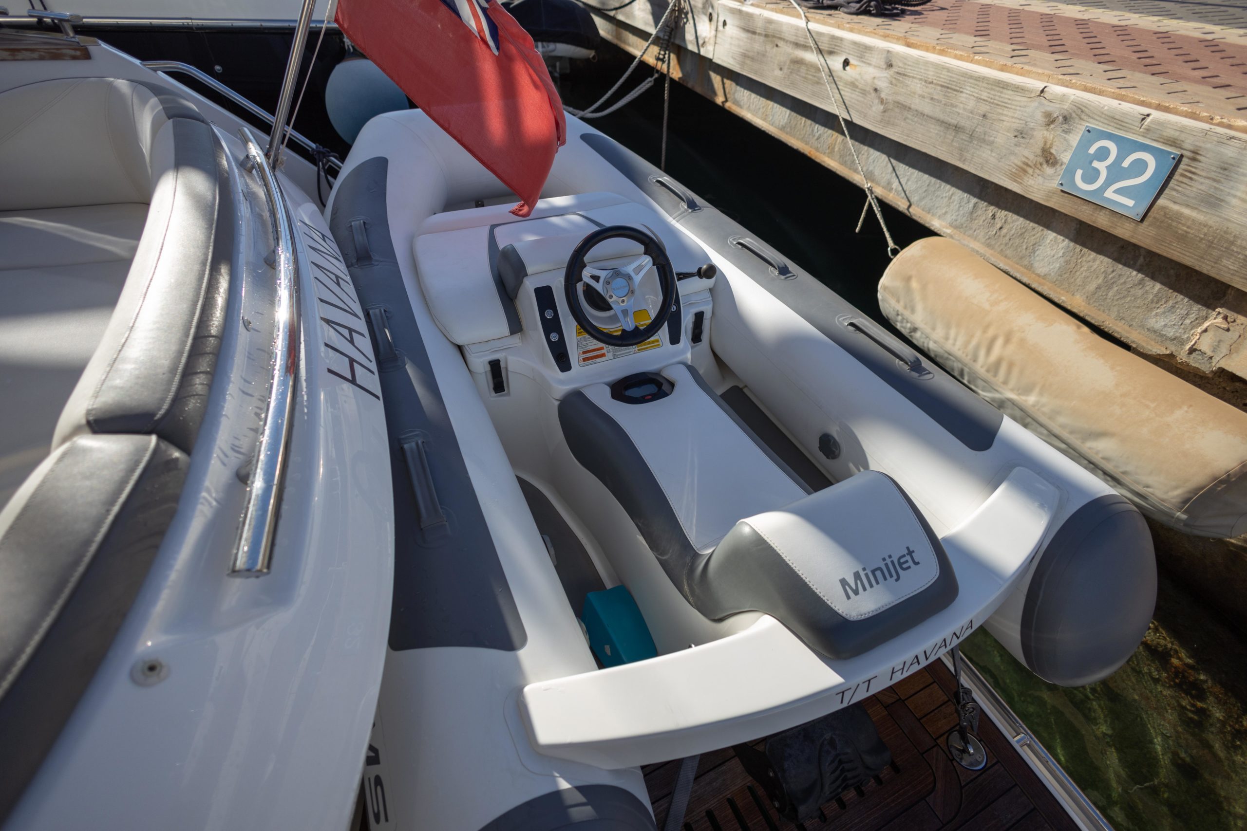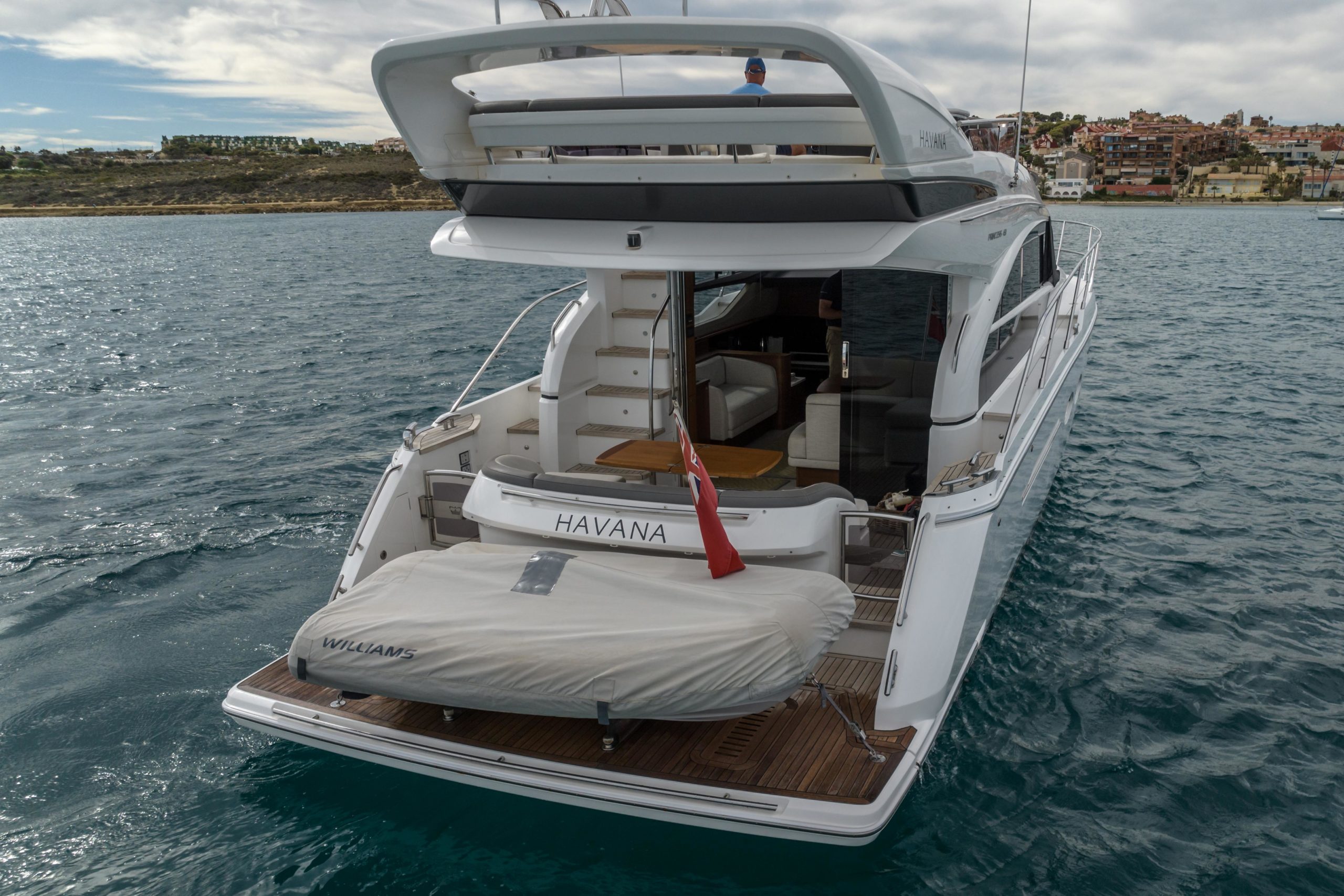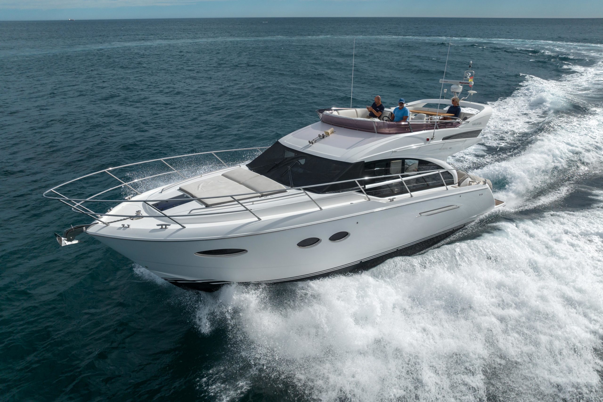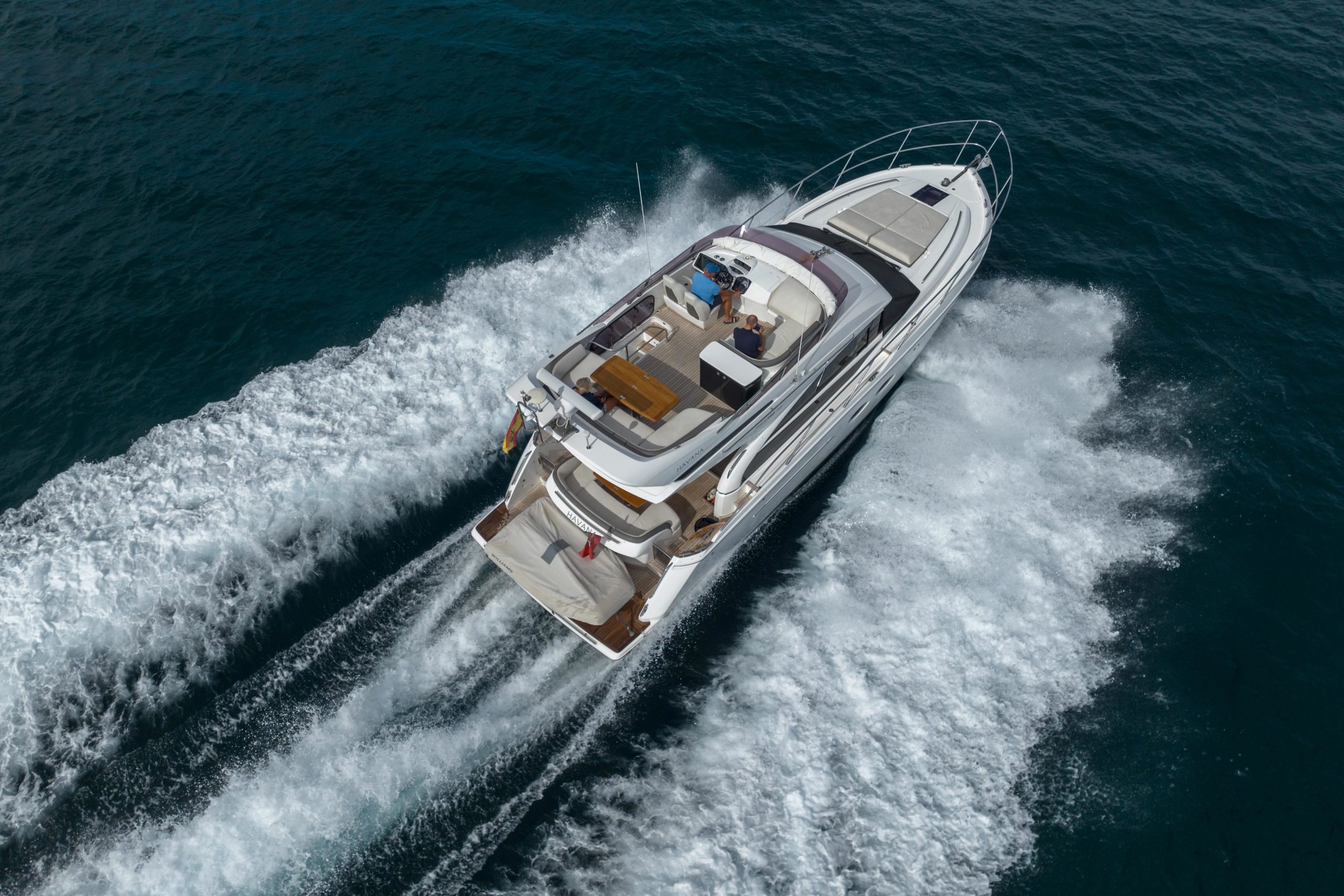 Twin Cummins QSB 6.7 (550hp each) • White hull • 2 cabins accommodating 4 guests • Variable speed bow and stern thrusters • Starboard twin cabin with electrically powered double berth conversion • Flybridge wet bar with sink, electric griddle/BBQ and storage • Onan 9.5kW generator • Underwater transom lights • Raymarine navigation equipment • Reverse-cycle air-conditioning • Premium audio system • Williams MiniJet available by separate negotiation