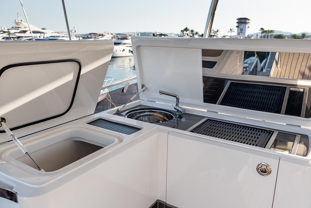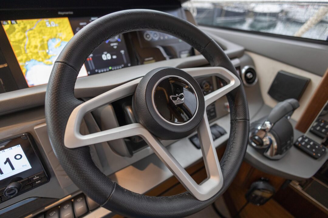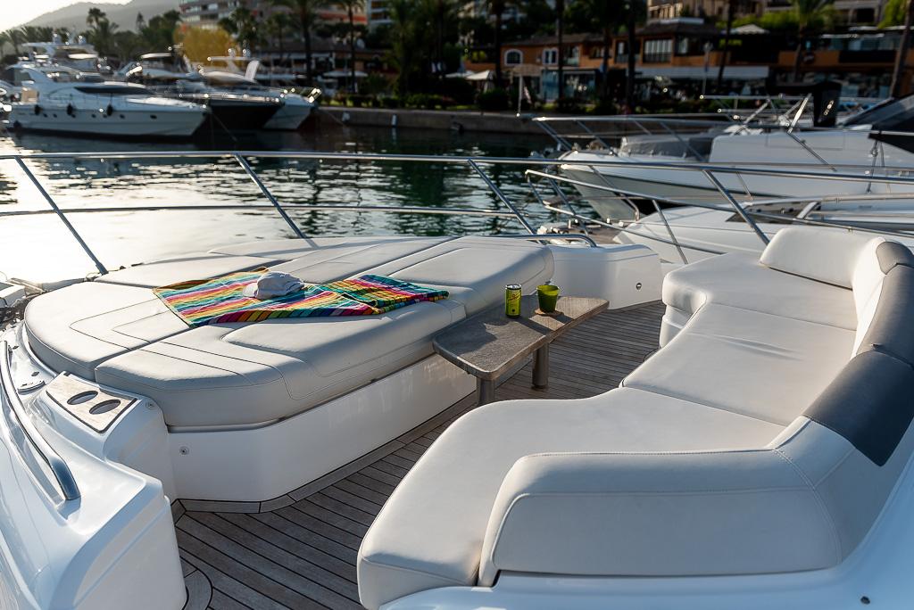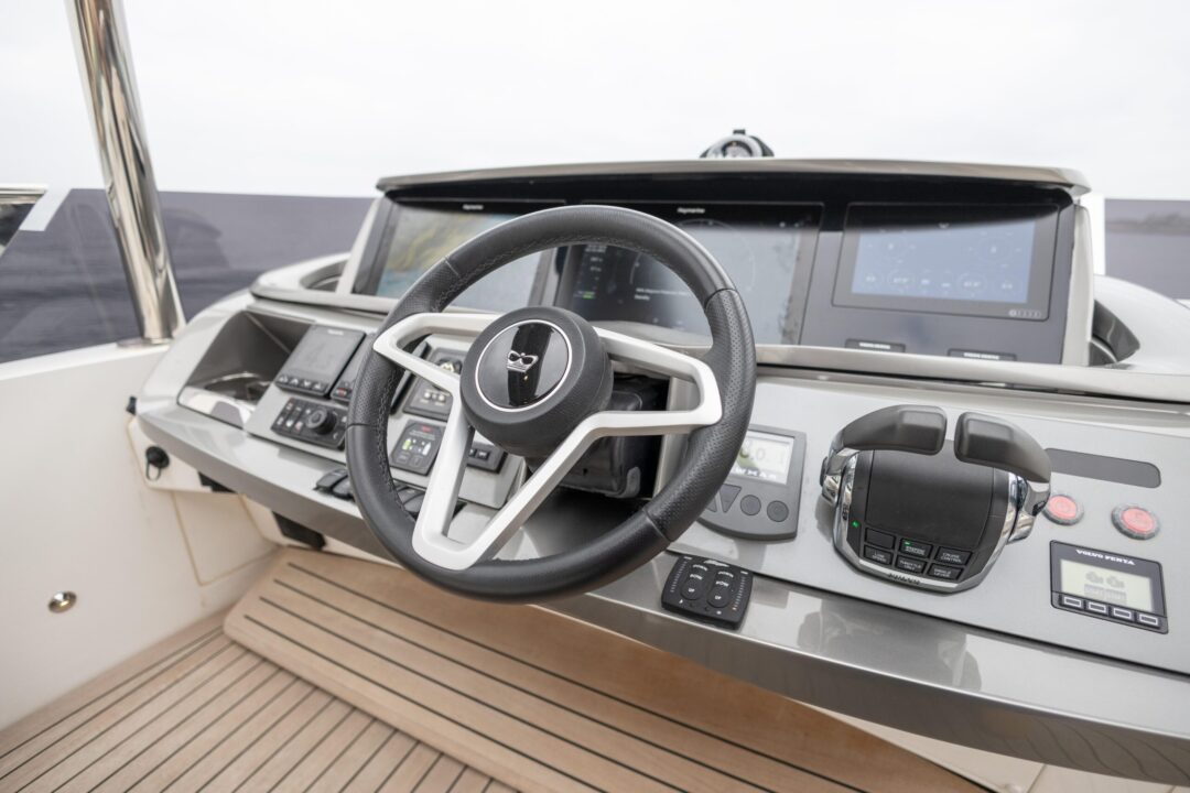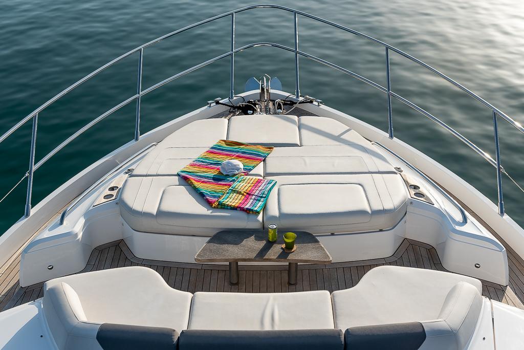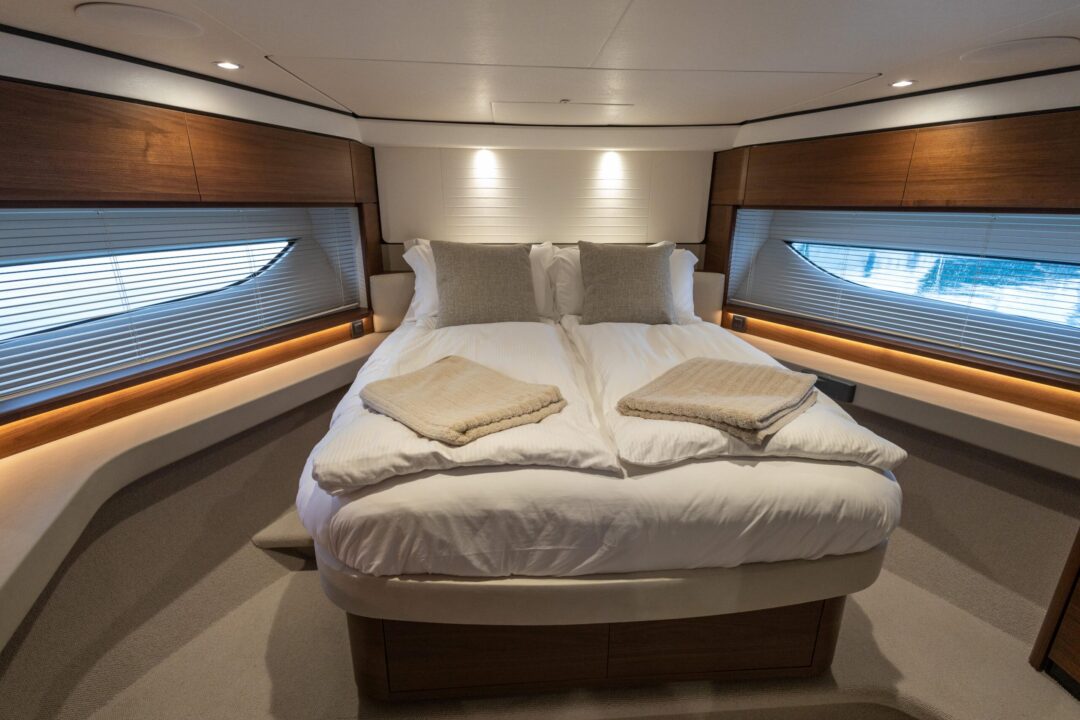 This yacht is designed for socialising. There are three beautifully appointed guest cabins – all en-suite, huge dining area, sunpad aft, and acres of space throughout the airy saloon. There is also, a unique circular forward seating area that can be converted to another sunpad if needed! All created with meticulous attention to detail to create an environment that’s modern, cool and fresh.